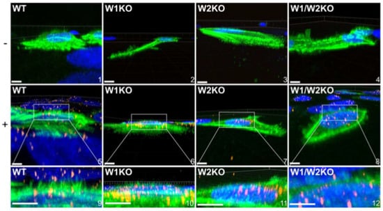 Since HPV16 stimulated dorsal surface actin protrusions in WT cells, we repeated the above imaging assay in W1KO, W2KO, and W1/W2KO cells to investigate differences in HPV16-induced dorsal surface protrusions compared to WT (Figure 7).