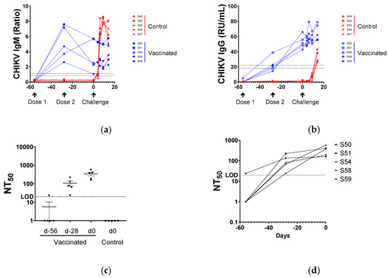 Prior to the first immunisation (day-56), four of five macaques had no detectable CHIKV neutralising activity in the serum, whereas the serum sample of one macaque (S50) had sero-reactivity at the limit of detection (LOD 1:20 dilution). Twenty-eight days after the first immunisation (day-28), serum from all vaccinated animals was able to neutralise CHIKV, and neutralising activity was boosted with the second immunisation. On the day of the virus challenge, the range of the neutralisation titre was 160–586 NT50. For animal S50, which had marginal neutralising activity prior to immunisation, serum neutralising activity rose more than five-fold by day 28, and by a further 0.2-fold by the day of challenge (day 0), which is a similar level to that seen in other vaccinees. No serum-neutralising activity was detectable in the serum of controls on the day of the virus challenge (Figure 2c,d).