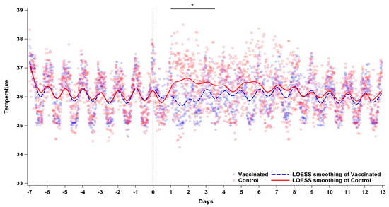 Temperature profiles of BBV87-immunised (blue) and control (red) macaques before and after CHIKV challenge at time 0 (represented by dotted line). Lines represent LOWESS (Locally Weighted Scatterplot Smoothing) smoothed means of the groups, and points represent individual readings. Asterisk denotes time of significant increase in temperature in control group compared to vaccinated group from 24 to 84 h post-challenge (p < 0.05).