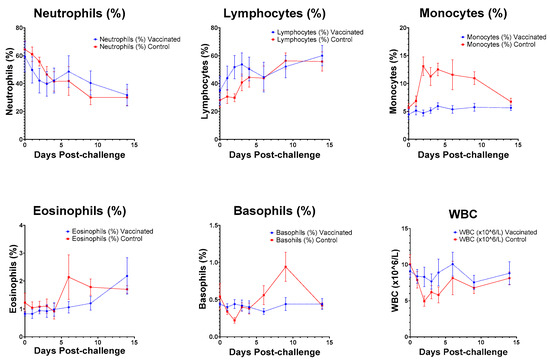 Five-part haematology analyses were performed on blood samples. Between days two and six, post-virus challenge total WBC counts were lower in controls compared to in vaccinated macaques. This trend belied an increase in lymphocytes in BBV87-vaccinated macaques between days 1 and 6 and a marked increase in monocytes in placebo-treated macaques on days 2–14 (Figure 5). No perturbation of clinical chemistry markers was observed in any individual (Supplementary Table S2).