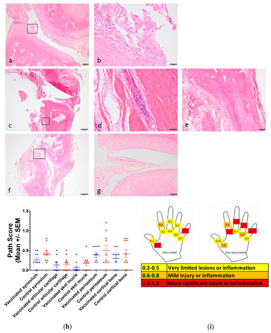 Representative images of pathology present within the finger joints of non-vaccinated (a–e) and vaccinated (f,g) cynomolgus macaques at termination (14–15 days post-challenge). (a) Lymphocytic and plasma cell infiltrate within synovium (scale bar = 200 µm), (b) higher magnification of boxed area of joint articulating surfaces with lymphocytes and plasma cells widely distributed within the synovium indicating early events in the development of an arthritic response (scale bar = 50 µm). (c–e) Lymphocytic and plasma cell inflammatory infiltrates present within skeletal muscle indicative of viral aetiology ((c): scale bar = 500 µm and boxed area shown in (d), scale bar = 50 µm, (e) scale bar = 500 µm). (f) Joint from vaccinated animal with no inflammatory pathology present (scale bar = 500 µm). (g) higher magnification of boxed areas of joint articulating surfaces showing a normal synovium (scale bar = 100 µm. (h) Points represent the scores for each individual animal; for each pathology parameter, lines represent mean ± SEM, (i) schematic representation (finger and location) of inflammatory changes in the right-hand knuckle or finger joints from vaccinated (s50, left hand image) and control animals (right hand image).