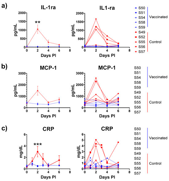 (a) IL-1ra, (b) MCP-1 and (c) CRP levels post-challenge in vaccinated (blue with dashed lines) and control (red with solid lines) animals plotted as mean ± SEM (left panels) and as individual plots (right panels). Statistical significance determined by Anova test with Post-hoc Bonferroni (*** p < 0.01, ** p < 0.05).