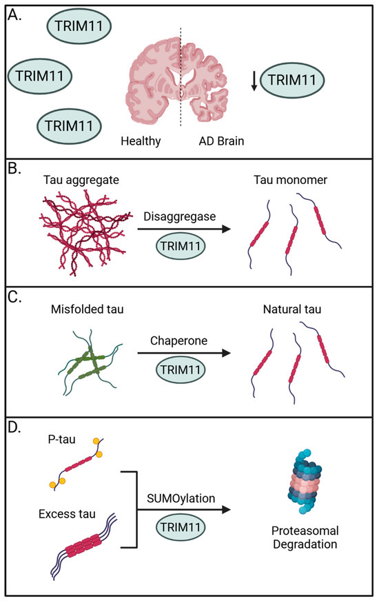 Importantly, TRIM11 has been linked to the onset of progressive supranuclear palsy (PSP), a prevalent form of sporadic tauopathy, wherein TRIM11 single nucleotide polymorphisms are associated with disease [60]. Supporting a general role for TRIM11 in human tauopathies, brain samples from 23 sporadic AD brains showed a marked reduction in TRIM11 protein expression when compared to 14 age- and sex-matched healthy controls. This absence in TRIM11 was confirmed at the individual neuron level and suggests the loss of TRIM11 may have a direct role in promoting AD (Figure 1A). Mechanistically, the authors determined TRIM11 functions as both a molecular chaperone and disaggregase for tau by directly binding and promoting the SUMOylation of tau for proteasome-mediated degradation and by maintaining solubility of tau to prevent self-association (Figure 1B–D) [56].