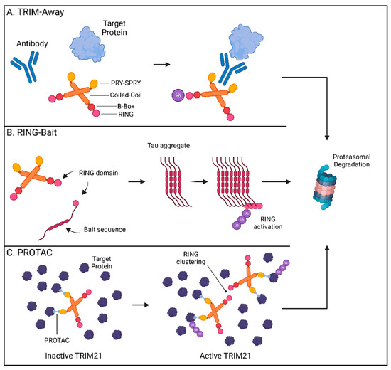 The ability to selectively recognize and degrade multimeric proteins has gained TRIM21 traction as a promising way to overcome difficulties in removing established intracellular aggregates. Since TRIM21 requires clustering of its RING domain to initiate ubiquitination and degradation [100,101], incorporation of the RING domain into fusion chimeras has allowed for selective targeting of multimerized forms of tau proteins by bringing enough RING domains in contact upon aggregation [99]. While these methods have utilized nanobody technologies as delivery platforms, a new approach has been to fuse these catalytic drivers of TRIM proteins directly to an offending protein “bait”. The resulting “RING-Bait” can focus the degradative potential of TRIM21 to large disease-causing aggregates without impacting the target’s pool of functional monomers (Figure 2B) [102].