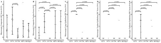 Median composite PPIV1 microscopic LRT, microscopic trachea lesion, and IHC scores by treatment group at 5 DPI necropsy. Error bars represent 25th, 50th, and 75th quartiles, respectively. Points are jittered horizontally to prevent overplotting. All data were analyzed with a Kruskal–Wallis test and a post hoc Dwass–Steel–Critchlow–Fligner test if significant. Significance brackets are provided if p < 0.1. (A) Median composite microscopic LRT lesion scores by treatment group. Composite LRT scores were slightly increased in the NV/C group; however, no significant differences were observed in the other challenge groups. (B) Median microscopic trachea lesion scores. Composite scores were significantly increased in the NV/C, RP/C and RPAdj/C groups compared to the NV/NC group. No significant difference was observed between the LE/C and NV/NC groups. Median microscopic PPIV1 IHC scores in the (C) lung, (D) trachea, (E) NT epithelium. Reduced PPIV1 signal was consistently observed in the LE/C, NV/NC, RP/C, and RPAdj/C groups across tissue sections. PPIV1: porcine parainfluenza virus 1; LRT: lower respiratory tract; IHC: immunohistochemistry; DPI: days post inoculation; NV/NC: non-vaccinated/non-challenged; NV/C: non-vaccinated/challenged; RPAdj/C: RNA particle adjuvanted vaccine/challenged; RP/C: RNA particle vaccine/challenged; LE/C: live exposed/challenged.