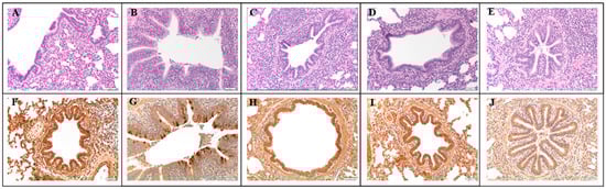 Representative microscopic histopathology lesions (A–E) and IHC staining (F–J) from fixed lung at 200× magnification. Each column corresponds to a treatment group. (A) NV/NC, no microscopic lesions (B–E) corresponding to NV/C, RP/C, RPAdj/C, and LE/C groups, respectively. Mild epithelial proliferation and peribronchiolar cuffing was observed in all groups, but most pronounced in the NV/C group. (F) NV/NC, no PPIV1 signal detected, (G) NV/C, abundant PPIV1 specific IHC signal in the bronchiolar epithelium, (H–J) corresponding to RP/C, RPAdj/C, and LE/C groups, respectively, with no or minimal PPIV1 signal detected. PPIV1: porcine parainfluenza virus 1; IHC: immunohistochemistry; NV/NC: non-vaccinated/non-challenged; NV/C: non-vaccinated/challenged; RPAdj/C: RNA particle adjuvanted vaccine/challenged; RP/C: RNA particle vaccine/challenged; LE/C: live exposed/challenged.