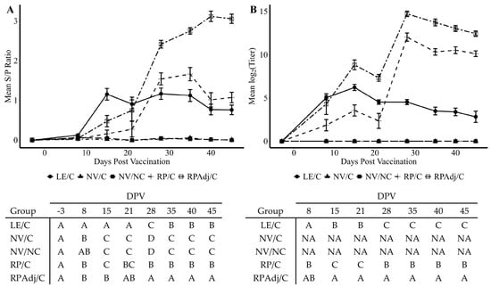 PPIV1 antibody detection demonstrated as (A) mean wvELISA sample to positive (S/P) ratios of circulating anti-PPIV1 IgG antibodies in serum; (B) mean log2 transformed SVN titers of circulating anti-PPIV1 neutralizing antibodies in serum. SVN titers are expressed as the reciprocal of the highest dilution with ≥95% reduction in infectivity. Significantly higher antibody levels were observed in the RPAdj/C and RP/C groups compared to the LE/C group by wv-ELISA and SVN at different days post vaccination. All data were analyzed using a linear mixed model with the most appropriate covariance structure determined by Akaike’s information criterion. Connecting letters reports shown under each figure are provided to indicate significance at p < 0.05. Groups with different letters are significantly different. PPIV1: Porcine parainfluenza virus 1; wvELISA: whole virus enzyme linked immunosorbent assay; SVN: serum virus neutralization; NV/NC: non-vaccinated/non-challenged; NV/C: non-vaccinated/challenged; RPAdj/C: RNA particle adjuvanted vaccine/challenged; RP/C: RNA particle vaccine/challenged; LE/C: live exposed/challenged; NA: Not analyzed to facilitate fit of the statistical model.