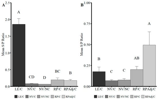 Systemic antibodies were significantly higher in the RPAdj/C groups after the second vaccination at 21 DPV compared to all other groups (p < 0.0001) suggesting an anamnestic response to the vaccine demonstrated at 28, 35, 40, and 45 DPV (Figure 4A). Detectable IgG antibody levels were measured in the LE/C group by 8 DPV compared to the RPAdj/C, RP/C, and NV/C groups (p < 0.02); however, the LE/C group lacked a significant difference compared to the NV/NC group (p = 0.14). Increased PPIV1 serum antibodies were also significantly higher in the RP/C group compared to the LE/C group at 28 DPV (p = 0.04). However, significant differences were not observed between the LE/C and RP/C groups on 35, 40, and 45 DPV (p = 0.06). Comparable mean S/P ratios were detected between the NV/NC and NV/C groups for the study duration (p > 0.1).
