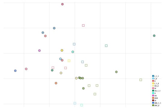 Antigenic map of NDVs based on MN data. Dots represent antigens and squares represent sera of individual immunized birds. The same color has been used for viruses and homologous antisera; superposition of two sera is represented by darker color of the square. The spacing between grid lines is 1 unit of antigenic distance corresponding to a two-fold dilution of antiserum in the MN assay.