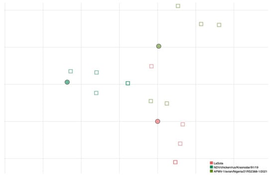 Despite NDV being considered a single serotype, several reports and studies have highlighted the effect of virus genetic variability on antigenic features and thus on cross-protection. Antibodies raised against the transmembrane hemagglutinin-neuraminidase (HN) and fusion (F) proteins are regarded as neutralizing, being able to block viral attachment and fusion, respectively [22,31,32,33,34]. The immune response is commonly monitored through a hemagglutination inhibition (HI) test that, although not fully representative of protection and viral shedding inhibition, is nevertheless of remarkable help to study cross-protection, particularly when applied in the framework of more modern techniques like antigenic cartography. Antigenic cartography was initially developed to measure the antigenic diversity between influenza viruses by comparing the reaction titers among the test antigens and reference antisera [35]. Its use has now been extended to other important pathogens to understand antigenic relatedness and to guide vaccine strain selection as antigenic cartography can simplify data interpretation through intuitive antigenic maps [35].