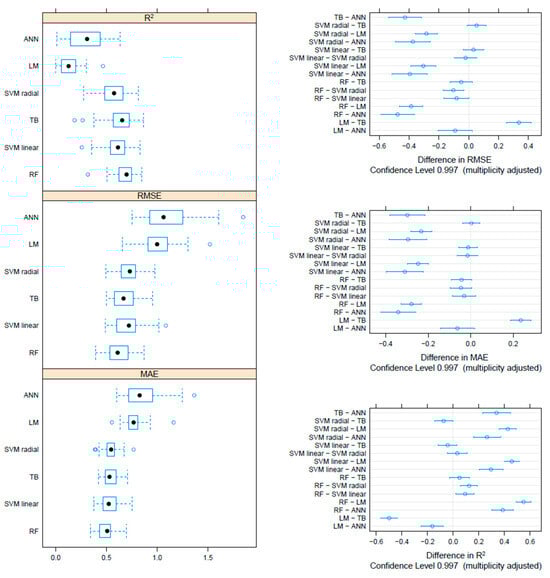 Unlike the RMSE, the higher the R2 (0 < R2 < 1), the better the performance for the compared models. The metrics were chosen for their complementary strengths—R2 to measure variance explained and overall fit, RMSE to penalize large errors, and MAE to provide a robust average error—thus ensuring a balanced evaluation of the model’s predictive performance.
