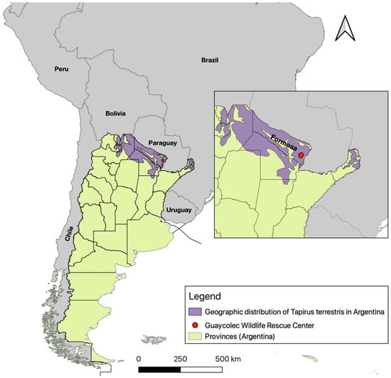 Map of Argentina showing its provinces, neighboring countries, and the location of the Guaycolec Wildlife Rescue Center in Formosa (25°58′55.1″ S, 58°09′42.4″ W). The map also includes the distribution of Tapirus terrestris in Argentina []. The northeastern region of the country is expanded for a more detailed view.
