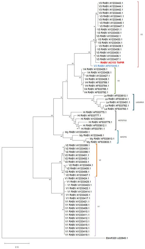 The phylogenetic analysis with a reference database confirmed that the tapir sample (RABV AC153 TAPIR in red) was classified within variant 3 and grouped with genetically related sequences (Figure 4). Both genetic and antigenic characterization techniques consistently identified the sample as variant 3 (Figure 3 and Figure 4).