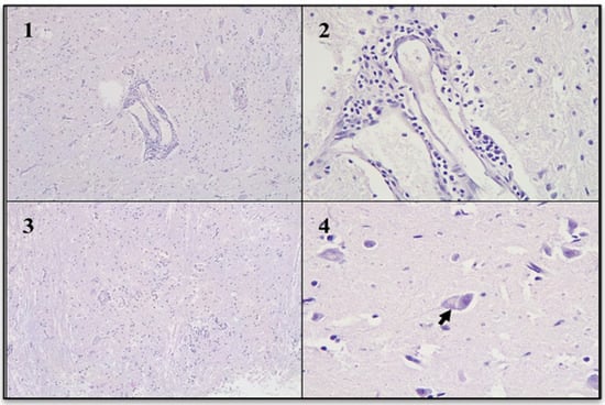 Non-suppurative encephalitis (Hematoxylin and eosin stain). (1): Gray matter with perivascular cuffs. (2): Perivascular cuffs were composed mainly of lymphocytes. (3): Gray matter with focal gliosis. (4): Neuronal body with vacuolation of the cytoplasm and intracytoplasmic acidophilic inclusion body (arrow).