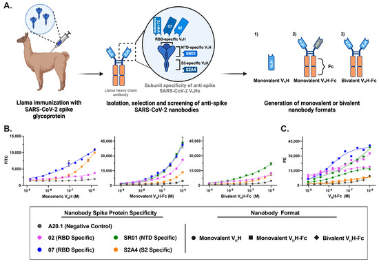 The VHHs used in this study were previously isolated and characterized [24]. The selected antibodies VHH 02, VHH 07, VHH S2A4, and benchmark VHH-72 [27] were expressed as monomers in bacteria and purified by immobilized metal-ion affinity chromatography (IMAC). Bivalent VHH-human IgG1 Fc fusions (02/02; 07/07, SR01/SR01, S2A4/S2A4, and VHH72/VHH72) were obtained by transient transfection of HEK293-6E cells and purified from the supernatant by protein A affinity chromatography. Monovalent VHH-Fc molecules were generated by co-transfection with two plasmids: (i) encoding Clostridioides difficile toxin A (A20.1)-Fc, C-terminally tagged with a 6×His, and (ii) encoding an untagged VHH-Fc specific for SARS-CoV-2 spike protein. The resulting monovalent VHH-Fc is a bispecific heterodimer, with one VHH targeting the SARS-CoV-2 spike protein and second VHH specific for A20.1, an irrelevant nanobody also used in negative controls to assess nonspecific binding [32] (Figure 1A). The heterodimeric bispecific protein was purified by sequential protein A affinity chromatography and IMAC and eluted using a linear 0 to 0.5 M imidazole gradient over 7 column volumes to separate species bearing one (heterodimeric bispecific VHH-Fc) or two (A20.1 bivalent VHH-Fc) 6×His tags. VHHs and VHH-Fcs were buffer-exchanged into phosphate-buffered saline (PBS), pH 7.4. FITC conjugation (Thermo Scientific, Waltham, MA, USA, cat# 46410) was performed following manufacturer’s instructions with minor modifications. A total of 1 mg of each protein was buffer-exchanged into 50 mM borate, pH 8.5, and the labeling reaction was performed at a 1:1 molar ratio to achieve a gentle conjugation level. Free FITC was removed using Amicon® Ultra-15 Centrifugal Filter Units (Millipore-Sigma, St-Louis, MI, USA, cat#UFC905024) by buffer exchange into PBS, pH 7.4. Nanobody constructs were fluorescently conjugated to FITC via lysine residues, either within the VHH scaffold for monovalent VHHs or within the Fc region for monovalent and bivalent VHH-Fc constructs (Supplementary Table S1). While labeling is more likely to occur within the Fc region than the VHH, it remains possible that some labeling occurs within the VHH domain in VHH-Fc constructs.