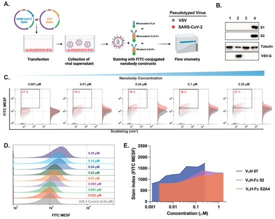 Optimization of fluorescent anti-SARS-CoV-2 spike nanobody staining for effective SARS-CoV-2 labeling and resolution in flow virometry applications. (A) Schematic representation of pseudotyped virus generation and staining with FITC-conjugated nanobodies for downstream FVM analysis. Pseudotyped viruses expressing the SARS-CoV-2 spike protein on their envelope (red) were compared to viruses expressing the vesicular stomatitis virus spike glycoprotein (VSV-G) (gray), which served as a negative control to assess non-specific binding. (B) Confirmation of S (S1 and S2 subunits) and VSV-G protein expression in viral supernatants via Western blot analysis. (C) Contour plots and (D) histogram plots showing the titration of RBD-specific monovalent VHH 07 over a concentration range of 0.002–0.25 µM. (E) Stain index comparison for monovalent VHH 07, bivalent VHH-Fc 02, and S2A4 nanobody constructs for the determination of the optimal staining concentration that provides minimal nonspecific binding. The stain index was calculated using the median fluorescent intensity in FITC MESF of positively and negatively labeled virus populations divided by the standard deviation of the negative population. The values represent the geometric mean of a single experiment. MESF, molecule of equivalent soluble fluorochrome.