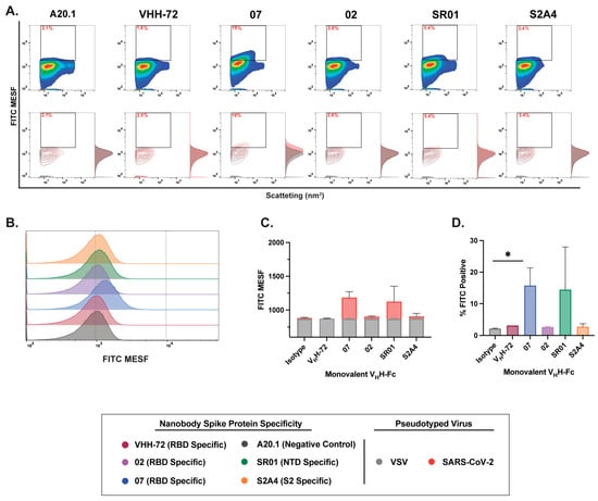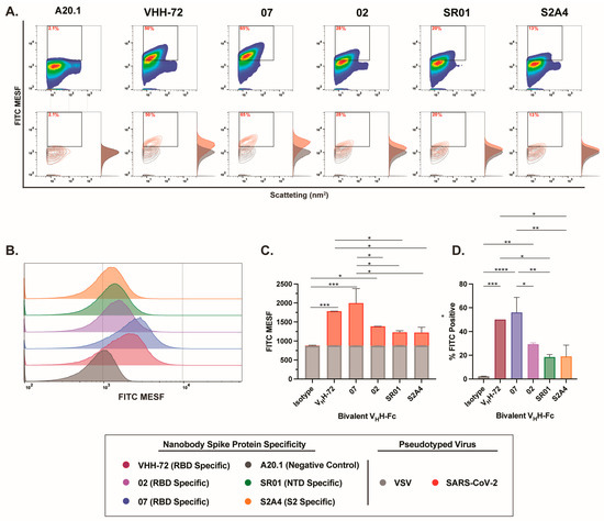 Lastly, labeling with bivalent VHH-Fc nanobodies resulted in the most effective staining and the highest resolution efficiency among all evaluated nanobody formats (Figure 5A,B). Notably, staining with RBD-specific nanobodies (VHH 02, VHH 07, and VHH-72) yielded the most effective labeling, with the majority of labeled particles clearly distinguishable from the background, as illustrated in both contour and histogram plots (Figure 5A). Notably, bivalent VHH-Fc 07 and VHH-72 demonstrated the greatest separation from the A20.1 negative isotype or VSV-G controls, indicating superior specificity and signal resolution (Figure 5A,B). Of note, while staining with NTD-specific SR01 and S2-specific S2A4 VHH-Fc nanobodies showed a positive trend in FITC signal and the resolution of FITC-positive particles relative to the negative controls (Figure 5C,D), this did not lead to statistical significance. Given the trimeric structure of the S protein, our results provide a direct comparison between monovalent and bivalent VHH-Fc constructs, highlighting that multimeric binding to the S antigen increases avidity and consequently enhances the staining efficiency of the bivalent VHH-Fc constructs. This is evident from the improved staining observed with bivalent VHH-Fc 02, S2A4, and VHH-72 nanobodies relative to the monovalent VHH-Fc constructs. These findings suggest that bivalent nanobody constructs may be particularly well suited for targeting complex, multidomain protein assemblies, such as viral glycoproteins, and that they may be suitable for FVM applications.