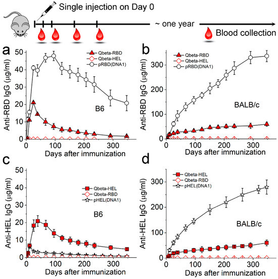 Duration of the IgG response induced by Qβ- or SVLS-conjugated Ags. A single injection followed by blood collection is schematically shown on top. (a,b) show concentrations of RBD-specific IgG in mouse sera from B6 (a) or BALB/c mice (b) collected over 300 days after a single injection of various agents listed in each inset. All IgG concentrations were measured using ELISA based on standard curves obtained from a reference monoclonal IgG mAb1 (Section 2.4). The doses of RBD on each particle were 0.24 µg per animal. (c,d) show concentrations of HEL-specific IgG in mouse sera from B6 (c) or BALB/c mice (d) collected over 300 days after a single injection of various agents listed in each inset. All IgG concentrations were measured using ELISA based on standard curves obtained from a reference monoclonal IgG mAb2 (Section 2.4). The doses of HEL on Qβ-HEL were 0.3 µg per animal, and the doses of HEL on pHEL(DNA1) were 0.1 µg per animal. Throughout Figure 2, N = 4 (4 animals per group) for each time point.