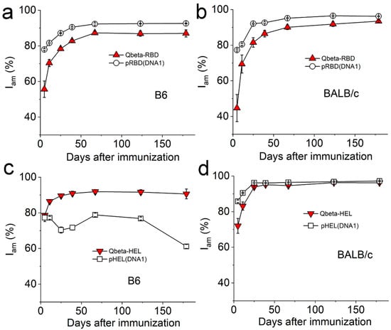 The quantitative progress of Ag-specific Ab affinity maturation in mice immunized with various agents. (a,b) show Iam of RBD-specific IgG in mouse sera from B6 (a) or BALB/c mice (b) collected over 6 months after a single injection of various agents listed in each inset. The doses of RBD on each particle were 0.24 µg per animal. (c,d) show Iam of HEL-specific IgG in mouse sera from B6 (c) or BALB/c mice (d) collected over 6 months after a single injection of various agents listed in each inset. The doses of HEL on Qβ-HEL were 0.3 µg per animal, and the doses of HEL on pHEL(DNA1) were 0.1 µg per animal. Throughout this figure, Iam was calculated directly from binding and dissociation traces measured using BioLayer interferometry (Section 2.7); N = 4 (4 animals per group) for each time point.