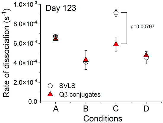 Moreover, we have examined the Ag binding and unbinding traces for sera samples collected from animals on Day 123 after immunization with various agents. As shown in Figure 5, at the same sera dilution factors, all the traces from SVLS-immunized animals (cyan) showed much higher binding amplitudes than those animals immunized with Qβ-conjugates (red traces), except pHEL(DNA1) in B6 mice (Figure 5c). These results are consistent with ELISA data shown in Figure 2 and indicate higher Ag-specific IgG concentrations in SVLS-immunized animals. Furthermore, the unbinding traces allowed us to directly examine the off rates for IgG in binding to their respective Ags. As shown in Figure 6, between SVLS (circles) and Ags conjugated on Qβ VLPs (red triangles), the off rates for Ag-specific IgG in dissociation from their respective target were all identical within error, except for HEL-conjugated Ags in B6 mice. This is the case for Condition A in B6 mice between pRBD(DNA1) and Qβ-RBD, Condition B in BALB/c mice between pRBD(DNA1) and Qβ-RBD and Condition D in BALB/c mice between pHEL(DNA1) and Qβ- HEL. For Condition C, the off rate for HEL-specific IgG from B6 mice that were immunized with pHEL(DNA1) is 1.6-fold higher than that for HEL-specific IgG from B6 mice that were immunized with Qβ-HEL, with a p-value of 0.00797 from a one-way ANOVA test. This is fully consistent with the fact that pHEL(DNA1) was unable to induce affinity maturation in the B6 genetic background but the structural proteins in Qβ VLPs can recruit T cells to help accomplish affinity maturation, as shown in Figure 4c.