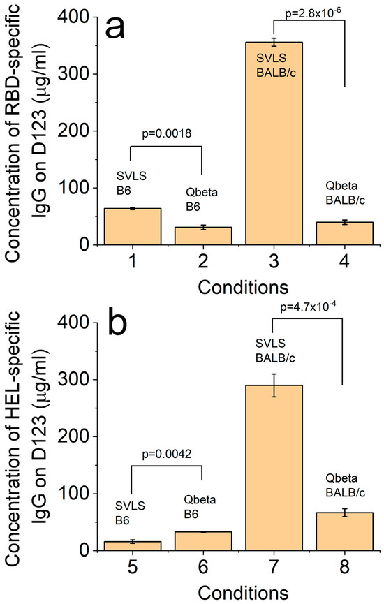 Concentrations of RBD-specific IgG (a) and HEL-specific IgG (b) in mouse sera collected on Day 123 post immunization with respective particulate Ags. These concentrations were measured by capture of the Ag-specific IgG on magnetic beads followed by quantitative Western blotting as described in Materials and Methods (Section 2.8). For Conditions 1 and 3, the SVLS was pRBD(DNA1). For Conditions 2 and 4, the Qβ was conjugated with RBD. For Conditions 5 and 7, the SVLS was pHEL(DNA1). For Conditions 6 and 8, the Qβ was conjugated with HEL.