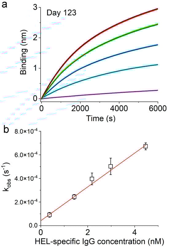 The availability of the physical concentration for the HEL-specific IgG allows us to determine the rate of IgG binding to HEL using the method that we reported recently [21]. This method entails BioLayer interferometry experiments at different concentrations of serum IgG to examine the dependence of the observed rate constants on IgG concentration (Section 2.7). Figure 8a shows the series of binding curves at different concentrations of the HEL-specific IgG, which were obtained from sera collected from BALB/c mice on Day 123 after a single immunization with Qβ-HEL. All of these binding curves can be well described by exponential functions (solid black lines). We plotted the observed rate constants from these exponential fits as a function of the HEL-specific IgG molar concentration in Figure 8b, which showed the expected linear dependence (squares) with an adjusted R-square value of 0.995 (straight red line). The slope of this line determined the bi-molecular rate constant for the binding between HEL and HEL-specific IgG, which was (1.43 ± 0.05) × 105 M−1s−1 on Day 123. This rate constant is very close to that of HEL-specific IgG collected from BALB/c mice immunized with pHEL(DNA1), which was (1.29 ± 0.03) × 105 M−1s−1 [21]. The equilibrium binding constant between HEL-specific IgG and HEL as determined from the on and off rate constants is, thus, (3.0 ± 0.4) × 108 M−1 for BALB/c mice immunized with Qβ-HEL, which is identical within error to (2.9 ± 0.1) × 108 M−1 for HEL-specific IgG from BALB/c mice immunized with pHEL(DNA1). These results are quantitatively consistent with the degree of Ab affinity maturation that we measured for these animals, where both Qβ-HEL and pHEL(DNA1) immunization triggered affinity maturation in BALB/c mice that were indistinguishable in Iam on Day 123 (Figure 4d). In conclusion, these HEL-specific IgGs had the same affinities for their target, but Qβ-HEL induced a much lower concentration of the Ab than SVLS in BALB/c mice.
