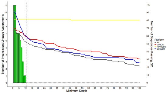 Lineage assignment inconsistency and qualified SARS-CoV-2 sequences across sequencing platforms. The bars show the number of samples with inconsistent lineage assignment across the three sequencing platforms. The lines show the number of qualified sequences from individual sequencing platforms and from all three sequencing platforms, with passing metrics of <10% ambiguous nucleotides and >90% genome coverage based on the minimum coverage depth. The vertical dashed line indicates the minimum coverage depth (11×) ensuring consistent lineage assignments for qualified sequences.