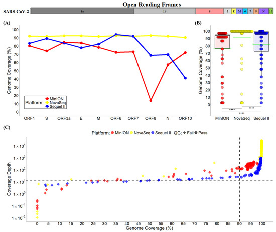 Percent mapping coverages across sequencing platforms. (A) The average mapping coverages based on > 10× sequencing depth across all 10 open reading frames (ORFs) of the SARS-CoV-2 genome within each sequencing platform. (B) Comparison of all-sample genome coverages among the three sequencing platforms. The green lines represent the mean mapping coverages for each individual sequencing platform. ****, p < 0.0001 between groups as indicated. (C) Distributions of coverage depth and genome coverage for all samples across the three sequencing platforms. The dashed lines represent >10× sequencing depth and >90% genome coverage.