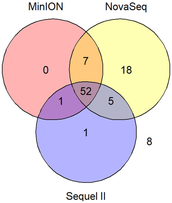 As shown in Table 1, a total of 16,889.40 Mbp and 261,428,474 reads were yielded from sequencing on the Illumina NovaSeq platform, with an average of 2,841,614 reads per sample. NovaSeq achieved an average base (Phred) quality score (probability of error per base call in a log scale) of 35.9, which is between 1 in 1000 to 1 in 10,000 probabilities of calling an incorrect base (99.9–99.99% accuracy). The average NovaSeq sequence length was 117 bp. A total of 576.16 Mbp and 932,604 reads were yielded from sequencing on the ONT MinION platform, with an average of 10,137 reads per sample. The average MinION sequence length was 584 bp, and 97.83% of the samples achieved an average base quality score higher than 20 (Q20). A total of 505.91 Mbp and 630,330 reads were yielded from sequencing on the PacBio Sequel II platform, with an average of 6851 reads per sample. The average Sequel II sequence length was 1129 bp per sample, and all the samples achieved an average base quality score higher than 30 (Q30). Overall, NovaSeq generated higher yield and total reads, while Sequel II sequences had longer reads; all sequences from these two platforms achieved a 100% Q30 score.
