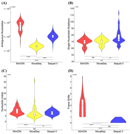 The sequence ambiguity and variant mutations called from the qualified SARS-CoV-2 consensus genomes across all three sequencing platforms were further analyzed (Figure 4). Specifically, the largest (p < 0.0001) number of ambiguous nucleotides was found in the MinION sequences, while the NovaSeq sequences had the lowest (p < 0.0001) level of ambiguity (Figure 4A). Furthermore, a relatively larger averaged number of single-nucleotide mutations (SNPs) was called from the consensus sequences generated by the Sequel II platform, while similar median numbers of SNPs were observed among all three sequencing platforms (Figure 4B). Fewer (p < 0.01) nucleotide indel mutations were called from the NovaSeq sequences, while no significant (p > 0.05) difference was observed between the MinION and Sequel II platforms (Figure 4C). In addition, a significantly larger (p < 0.0001) number of frame shifts was observed in the MinION sequences, while no significant (p > 0.05) difference was observed between the NovaSeq and Sequel II platforms (Figure 4D). Overall, MinION sequences had the highest numbers of ambiguous nucleotides, indels, and frame shifts, posing potential issues on quality and accuracy.
