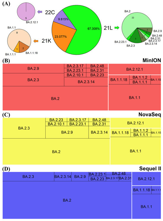 Phylogenetic distributions of the assigned SARS-CoV-2 genomes. (A) The main pie chart showing assigned Nextstrain SARS-CoV-2 clades for the 52 samples with qualified sequences across all three sequencing platforms, with extended pie charts showing Pango SARS-CoV-2 lineages assignments. (B–D) Tree maps showing the detailed Nextstrain SARS-CoV-2 clade and Pango SARS-CoV-2 lineages assignments for the 60, 82, and 59 qualified sequences from the Oxford Nanopore Technologies MinION, Illumina NovaSeq, and PacBio Sequel II sequencing platforms, respectively.