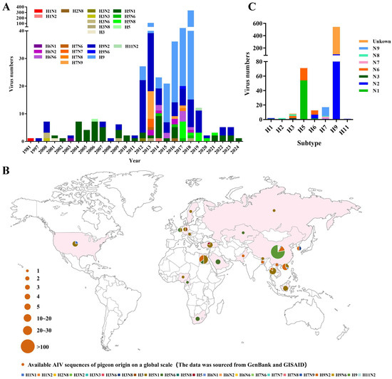 All previously published sequences of pigeon AIV strains were downloaded from the Global Initiative on Sharing Avian Influenza Data (GISAID, www.gisaid.org, accessed on 15 April 2025) and the Influenza Virus Resource at the National Center for Biotechnology Information (www.ncbi.nlm.nih.gov/genomes/FLU, accessed on 15 April 2025).