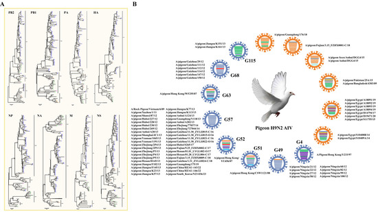 H9 influenza virus was first isolated from turkeys in North America in 1966 [37], and it has become the most prevalent subtype of AIV in multiple avian species [35,38,39]. In pigeons, H9N2 AIV is also the most prevalent subtype, as 543 strains have been reported, including 77 whole viral genomes (Table S1) and 465 partial viral gene fragments. According to the defined criterion based on the phylogenetic analysis of eight AIV fragments used in a previous study [12] (Figure 5A), we observed that 14 genotypes were defined for the 77 H9N2 viral whole genomes, including 8 reported stable or transient genotypes and 6 novel genotypes. Forty-two strains, including A/Rock Pigeon/Vietnam/6/2009, A/pigeon/South_Korea/N23-036/202340, and Chinese H9N2 AIV strains from different provinces, were classified under the H9N2 AIV G57 genotype, which is the dominant genotype in pigeons, as reported in other poultry species. G49, prevalent in Chinese Ningxia, and G68, prevalent in Chinese Guizhou, were also the major stable H9N2 AIV genotypes in pigeons, which contain eight and six strains, respectively. Two strains from the Chinese Jiangsu Province were classified into the transient G115 genotype. Four strains from Chinese Hong Kong were classified into the G4, G51, G52, and G63 H9N2 AIV genotypes, respectively. The remaining strains were classified into six novel genotypes, among which three genotypes contain strains from Guangdong Province, Fujian Province, and Anhui Province. Two strains from South Asia, including A/pigeon/Pakistan/25A/2015 and A/pigeon/Bangladesh/4303/2009, were classified into one novel genotype. The pigeon H9N2 AIV strains from Egypt were classified into two novel genotypes, with the later genotype derived from the earlier genotype, and it gained a novel NP fragment. The results suggested that the distribution of the H9N2 subtype of pigeon AIV possessed regional and spatiotemporal characteristics. In addition, a pigeon H9N6 subtype AIV strain A/pigeon/Fujian/9.25_FZHX0007-C/2017 has been reported, which might be re-contaminated by gaining an NA fragment from the duck-derived H6N6 subtype of AIV.