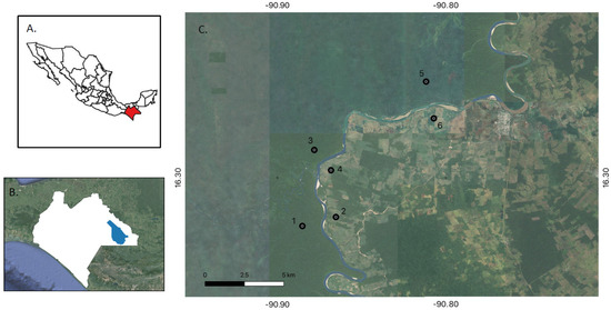 Geographic locations of the study area and sites, with (A) Chiapas shaded red, (B) Chiapas and the Lacandona Rainforest shaded white and blue, respectively, and (C) study sites denoted as black circles (designated 1 to 6) and longitudinal and latitudinal coordinates provided.