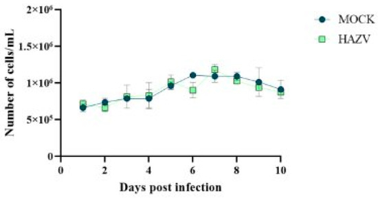 Cell viability in HAZV-infected and uninfected tick cells over 10 days. The graph illustrates the number of live cells per mL in HAZV-infected (MOI 0.1) and uninfected (MOCK) HLE/LULS42 cells over a 10-day post-infection period. Error bars represent standard deviation (S.D.).