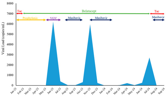 While CMV remained undetectable in the following month, viral reactivation occurred in April 2024, with levels reaching 243 copies/mL. In response, we implemented a modified therapeutic approach by reducing the belatacept infusion dosage to 4 mg/kg every 28 days. This intervention initially achieved viral suppression below the quantification threshold in the subsequent month. However, viral rebound occurred in June 2024, with CMV levels of 268 copies/mL, followed by a further elevation to 2771 copies/mL in July 2024.