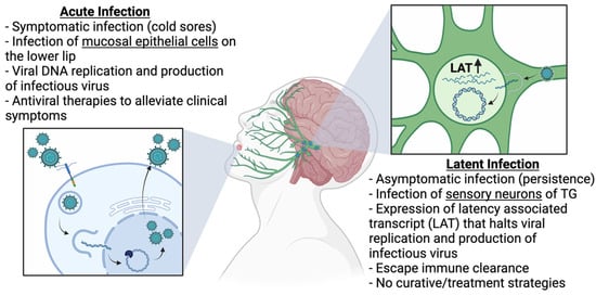 Oral herpes, or herpes labialis, is a common outcome of HSV-1 infection and accounts for the majority of HSV-1 infections. Herpes labialis is characterized by the presence of cold sores that appear around and inside the mouth. Transmission of HSV-1 infection via an oral route occurs following direct or indirect contact with an oral cold sore or saliva from an infected individual. At the site of transmission, which is typically around the lips, HSV-1 replicates and propagates in mucosal epithelial cells, leading to the formation of cold sores [2,3]. Simultaneously, HSV-1 enters nearby sensory neurons and is transported to the TG, where it establishes a latent infection. As acute infection in the periphery resolves, patients become asymptomatic for infection but retain HSV-1 inside latently infected sensory neurons, which provide a reservoir for future reactivation (Figure 1). Reactivation is often triggered by external and internal stress stimuli that induce the release of HSV-1 from the TG and recurrence of acute infection at the initial transmission site [8].