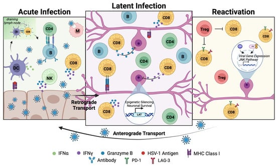 While the role of the adaptive immune response during latent infection is to suppress reactivation, many patients nevertheless experience recurrent outbreaks of acute infection. Due to the continuous and close association of CD8+ T cells and latently infected sensory neurons in the TG, it is understood that a disruption in the adaptive immune response is necessary for HSV-1 neuronal escape and reactivation [183]. While this disruption is likely triggered by stress stimuli [8], reactivation is not predictable and can be affected by the competence of the host immune system. In a 60-day cohort study, immunocompetent adults experienced an average of 1.4 reactivations, with a range of 0–30 reactivations per 30 days and 16.4 reactivations annually [184]. In contrast, reactivations in immunosuppressed individuals may be more frequent due to lower immunological control over infection [185].