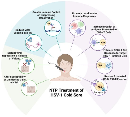 Despite the robust anti-HSV-1 immune response, HSV-1 is not cleared from the host. Vaccination strategies to overcome the limitations of immune control have been unsuccessful. In this review, we make a case for NTP as a disruptive technology, which has both antiviral and immunomodulatory activity (Figure 3). It is an inexpensive, safe, and non-invasive strategy for the control of acute and latent HSV-1 disease. Our previous investigations demonstrated the antiviral efficacy of NTP in disrupting viral replication and reducing susceptibility to HSV-1 infection, both of which will contribute to accelerated lesion resolution and reduced virus seeding into the TG. Furthermore, we hypothesize that NTP will boost the host immune system by expanding the breadth of antigens presented to the adaptive immune system and the development of an HSV-1-specific CD8+ T cell response. By strengthening the CD8+ T cell response, which can be bypassed by HSV-1 as the virus reactivates and causes recurrent disease, NTP will facilitate a more robust host immune response that will exert greater immune control in limiting acute infection and suppressing the reactivation of latent infection.