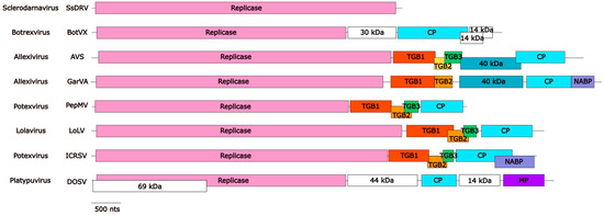 The alphaflexivirus replicase is encoded in the first and longest open reading frame (ORF) of the genome (Figure 1), with the exception of donkey orchid symptomless virus (DOSV) (Platypuvirus asinorchis), the only virus characterized thus far within its genus (see below). Following ORF1, there is a variable number of validated or hypothetical ORFs, ranging from none to five; their number and nature is a distinguishing feature of the genera within the family (Figure 1 and Table S2). Sclerotinia sclerotiorum debilitation-associated RNA virus (SsDRV) (Sclerodarnavirus sclerotiniae), the only virus in its genus, has the shortest genome, and no other ORF follows ORF1 (Figure 1 and Table S2). Viruses in the genus Botrexvirus, the other group of alphaflexiviruses that infect fungi, have three to four ORFs after the first one, which encode hypothetical proteins of unknown functions except for the CP (Figure 1 and Table S2). Genera Allexivirus, Lolavirus, and Potexvirus, the three of them being viruses that infect plants, have genomes structured in a similar manner (Figure 1 and Table S2); following ORF1, there is a conserved block of genes known as the triple gene block (TGB), with TGB1 being described as a multifunctional protein involved in virus movement, RNAi suppression, and formation of virus replication organelles (VROs), among other functions, and the small TGB2 and TGB3 as integral membrane proteins responsible for vesicle induction and required for virus movement [12,13] (see below). In the case of viruses in the genus Allexivirus, only three of them have a canonical TGB3 annotated in their genomic sequences, although TGB3s in this group may not contain a canonical initiation codon and may be translated by leaky scanning [14]. Also, for allexiviruses, TGB ORFs are followed by an ORF encoding a 40 kDa hypothetical protein conserved within the genus. The CP ORF follows, and there is a final ORF in the genomes of viruses of the two accepted subgenera encoding a cysteine-rich protein that is variable in size, with nucleic acid binding capacity (Figure 1) (see below).