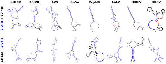 5′ and 3′ untranslated regions (UTRs) predicted structures of exemplar viruses within each genus and subgenus of the family Alphaflexiviridae. RNA structures include the 5′ and 3′-UTRs plus 60 nts downstream of the translation initiation codon, or upstream of the termination codon, respectively. The structure with the lowest initial Gibbs free energy (DG) was selected using the UNAFold web server. The UTR sequences are highlighted in dark blue. The positions of the putative conserved octanucleotide (ACCNNACC) and the GAAA sequence in the 5′ stem-loop 1 (5′SL1) are highlighted in red. 5′ end is denoted with a triangle and 3′ end with an asterisk.