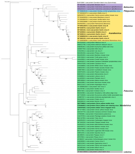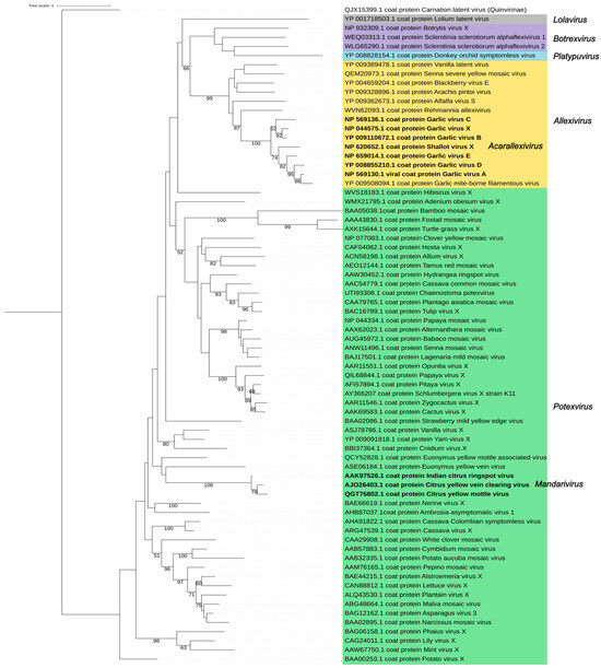 Phylogenetic analysis of full protein sequences of the coat protein (CP) of the family Alphaflexiviridae. The multiple sequence alignment of 72 CP sequences was performed using MUSCLE [41]. The best amino acid substitution method was inferred using MEGA 11 [42]. The maximum likelihood (ML) trees were inferred using RAxML-NG software [43] using the LG method considering the variation of the substitution rate among sites according to a gamma distribution (+G). The best ML tree with bootstrap support values (1000 replicates) is shown. Only bootstrap values higher than 50% are displayed. Carnation latent virus (QJX153999.1) (Carlavirus latensdianthi, family Quinivirinae) was used as an outgroup, and the tree was rooted with this sequence.