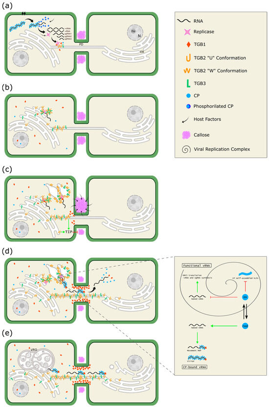 At later stages of infection, all virus-induced structures accumulate in the perinuclear region, forming a VRO that rivals the size of the cellular nucleus. This VRO is enclosed by reorganized host membranes, a process orchestrated by the coordinated activities of TGB proteins. VROs are highly organized, consisting of distinct VRCs, each containing a core of helically arranged TGB1 aggregates, surrounded by granules of TGB2/TGB3 (Figure 8e). These complexes, and the VRO, remain stable through a network of interactions between RdRp, TGBs, CP, vRNA, and virus-recruited host factors [61,81]. The incorporation of various viral proteins into endosomal vesicles has been documented; however, it remains uncertain whether this process reflects viral protein recycling, plant-mediated degradation, or even a potential mechanism for the virus to colonize non-symplastic connected tissues [75].