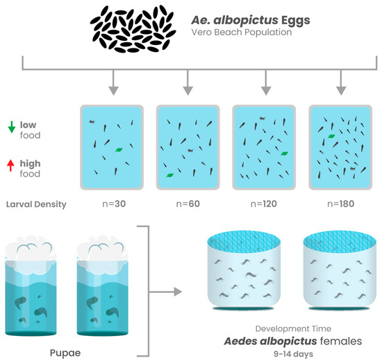 - Reiskind, M.H.; Lounibos, L.P. Effects of intraspecific larval competition on adult longevity in the mosquitoes Aedes aegypti and Aedes albopictus. Med. Vet. Entomol. 2009, 23, 62–68. [Google Scholar] [CrossRef]
