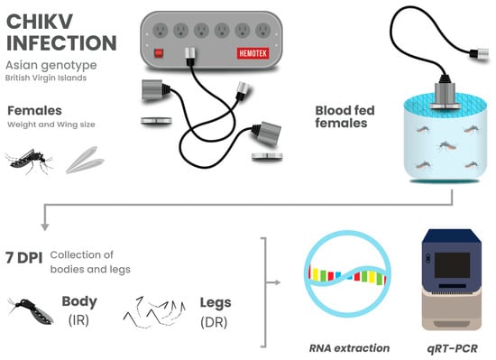 Infection rate was determined by the number of females with CHIKV RNA-positive bodies from the total number that fed on the infectious blood meal. Disseminated infection rate was determined by the number of females with infected bodies that had CHIKV RNA-positive legs [41,43]. Figure 1 provides a detailed schematic overview of the experimental design.