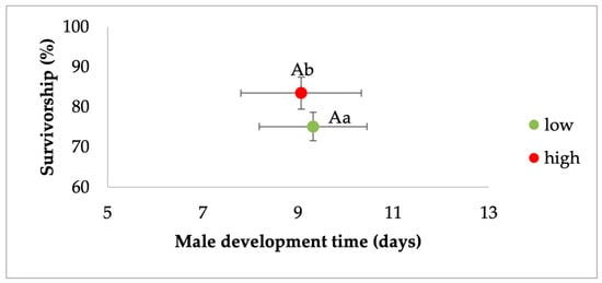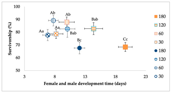 Analysis of the effects of food treatment on survivorship and development time of Ae. albopictus males. Bivariate least-squares means (±standard error) are shown for the dependent variables which had the greatest contribution to the multivariate effect. Means followed by different letters show significant differences (development time, capital letters, survivorship, lower-case letters).
