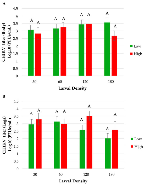 The percentage of mosquitoes exhibiting disseminated infection of CHIKV was measured by the number of females with infected bodies that had CHIKV RNA-positive legs. Overall, our results showed that mosquitoes’ viral dissemination was significantly affected by food effects and interaction between density and food (p = 0.0194 and p = 0.0473, respectively). We did not observe a significant effect by density alone (p = 0.0754). The significant food effect indicated that a higher percentage of mosquitoes exhibited disseminated infection (28% higher) derived from low-food conditions (45.62%) than from high-food conditions (32.78%). For the interaction, pairwise comparisons showed that mosquitoes from the 180 high food treatment had significantly lower disseminated infection (7.14%) compared to several other treatments, particularly 30 low (p = 0.0168) and 60 low (p = 0.0281). When analyzing the viral titer (expressed in log10 pfue/mL) in mosquito bodies and legs at seven days post-infection, ANOVA showed no significant effects between any of the treatment factors tested for food density and larval density (Table 5 and Figure 4). Although not significant, there is a trend for a lower viral titer in leg tissues among mosquitoes from the 180-larval-density treatment compared to lower-density treatments for low- and high-food conditions (Figure 4).
