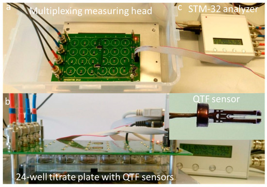 Parts of the measurement setup, including multiplexing measuring head (a), 24-well titration plate with QTF sensors (b), and the STM-32 analyzer (c) [30].
