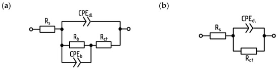 Primary (a) and simplified (b) electric equivalent circuits (EECs) used for the analysis of the measured impedance spectra [30].