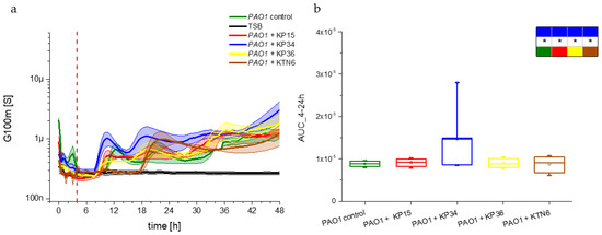 (a) Biofilm growth dynamics measured by the G100m parameter for P. aeruginosa PAO1 culture. The positive control consisted of untreated culture (green curve), negative control of TSA medium (black curve), and test samples treated with phages at VBR = 1 with specific Pseudomonas phage KTN6 (brown curve), and Klebsiella phages KP15 (red curve), KP34 (blue curve), KP36 (yellow curve). (b) Variability of the G100m parameter for the area under the curves estimated for the range from 4 to 24 h of the experiment. The boxes present the statistical significance analysis with the colors corresponding to the panel (a). The asterisk indicates a significant level of p > 0.05.